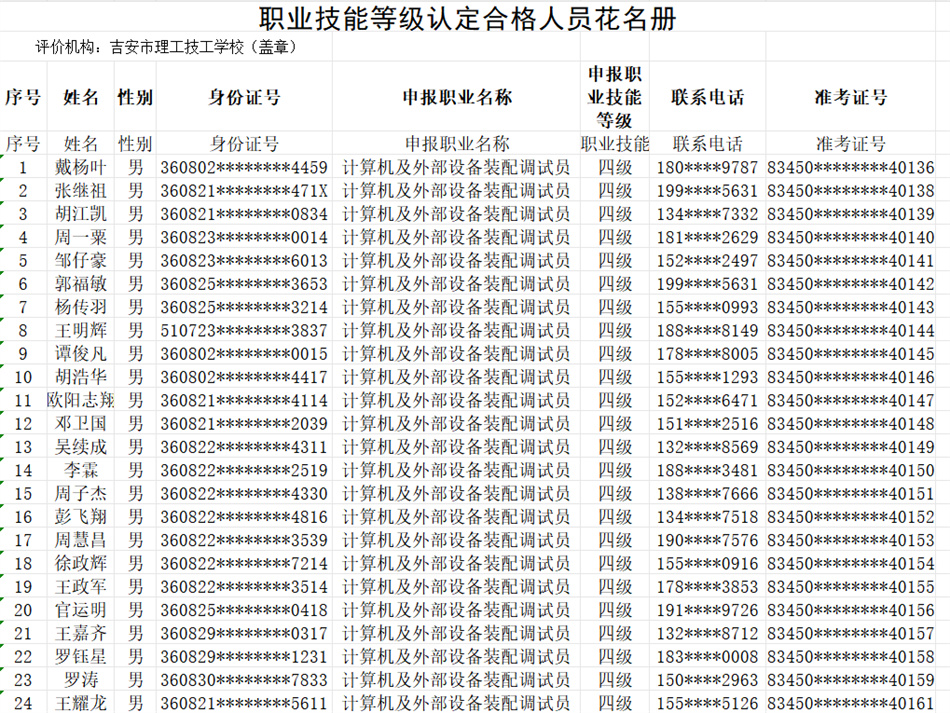 按照《贛人社規(guī)〔2022〕7號》文件精神。我校于2025年10月24日開展了計算機及外部設(shè)備裝配調(diào)試員(計算機整機裝配調(diào)試員)等級認(rèn)定,共58人(四級),通過認(rèn)定考核56人?,F(xiàn)對認(rèn)定考核合格人員進行公示。(名單附后)